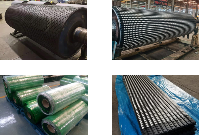 Pulley lagging is an important part and component of the conveyor belt system. The rubber coated roller can effectively improve the operation of the conveyor system and protect the metal roller from wear. Diamond or herringbone patterns, rubber coated surfaces of ceramic rubber plates can increase the friction on the surface of the rubber plate, effectively prevent the sliding friction between the roller and the belt, reduce the slippage of the belt, and reduce the adhesion of the material on the roller surface, thereby reducing the deviation and wear of the belt, improving the operating efficiency, and making the drum and the belt run synchronously to ensure the efficient and large-capacity operation of the belt. Widely used in: power plants, coal mines, cement plants, steel, metallurgy, coal, fertilizer, grain depots, ports and other industries.